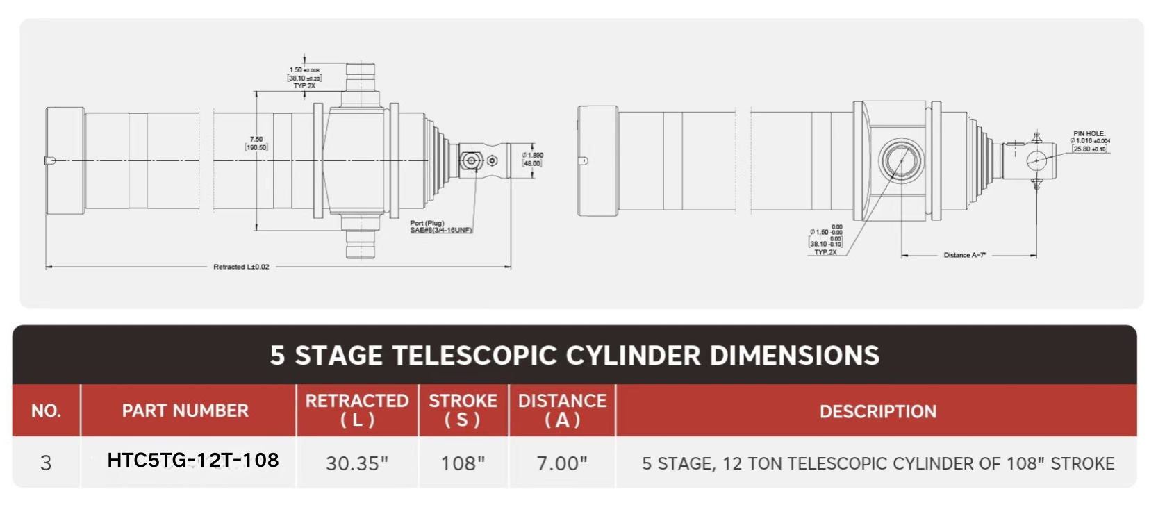 "HTC5TG-12T-108", 5 நிலை, 12 டன் ஆஃப் 108" ஸ்ட்ரோக் டெலஸ்கோபிக் சிலிண்டர்