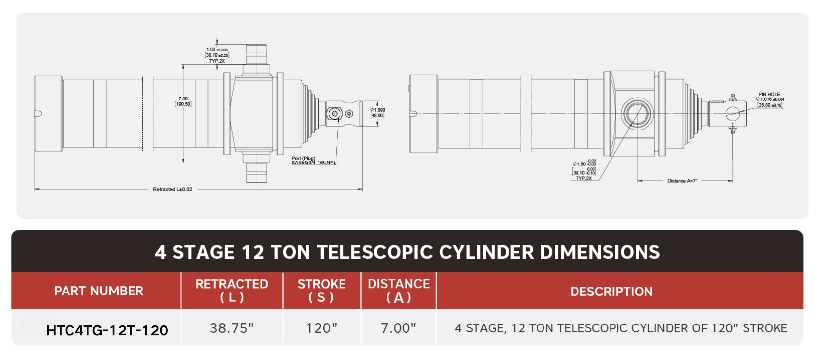 "HTC4TG-12T-120", 4 நிலை, 12 டன் ஆஃப் 120" ஸ்ட்ரோக் டெலஸ்கோபிக் சிலிண்டர்