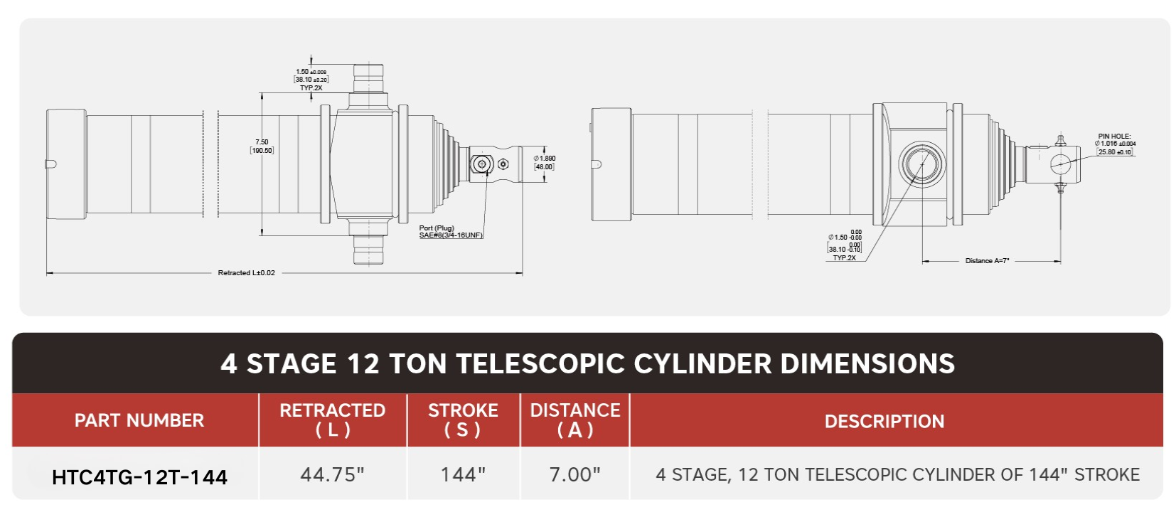 "HTC4TG-12T-144", 4 நிலை, 12 டன் ஆஃப் 144" ஸ்ட்ரோக் டெலஸ்கோபிக் சிலிண்டர்