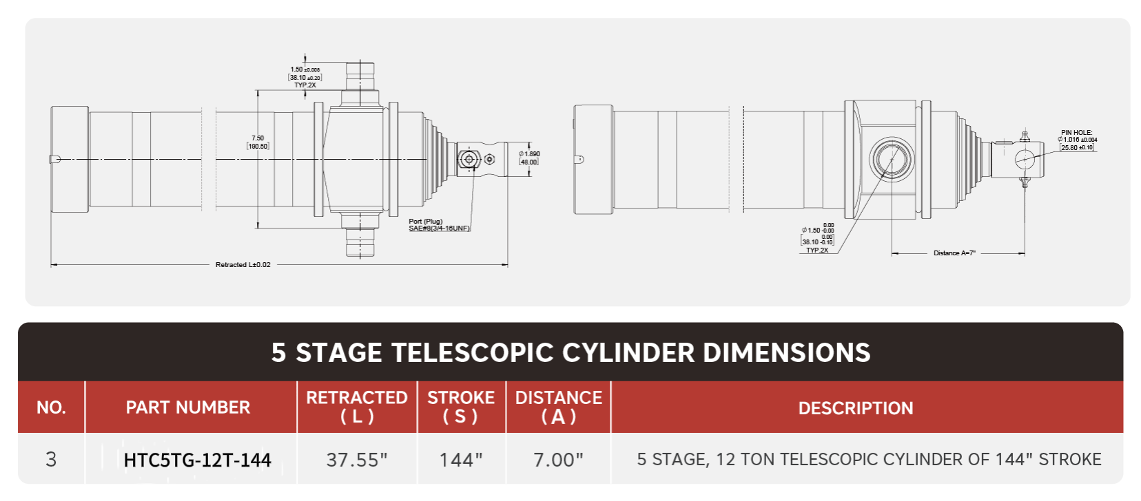 "HTC5TG-12T-144", 5 நிலை, 12 டன் ஆஃப் 144" ஸ்ட்ரோக் டெலஸ்கோபிக் சிலிண்டர்