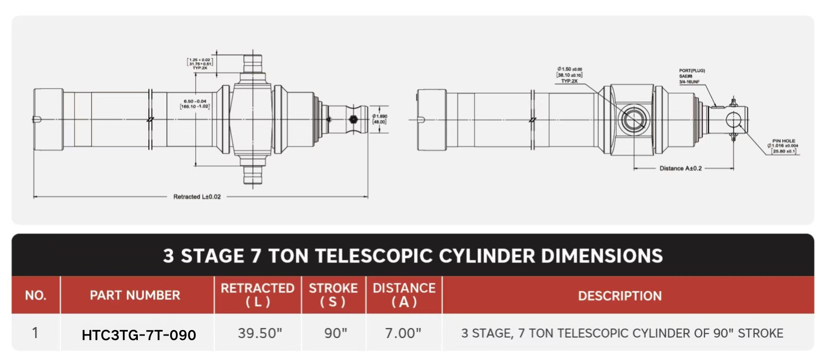 "HTC3TG-7T-090", 3 நிலை, 7 டன் 90" ஸ்ட்ரோக் டெலஸ்கோபிக் சிலிண்டர்கள்