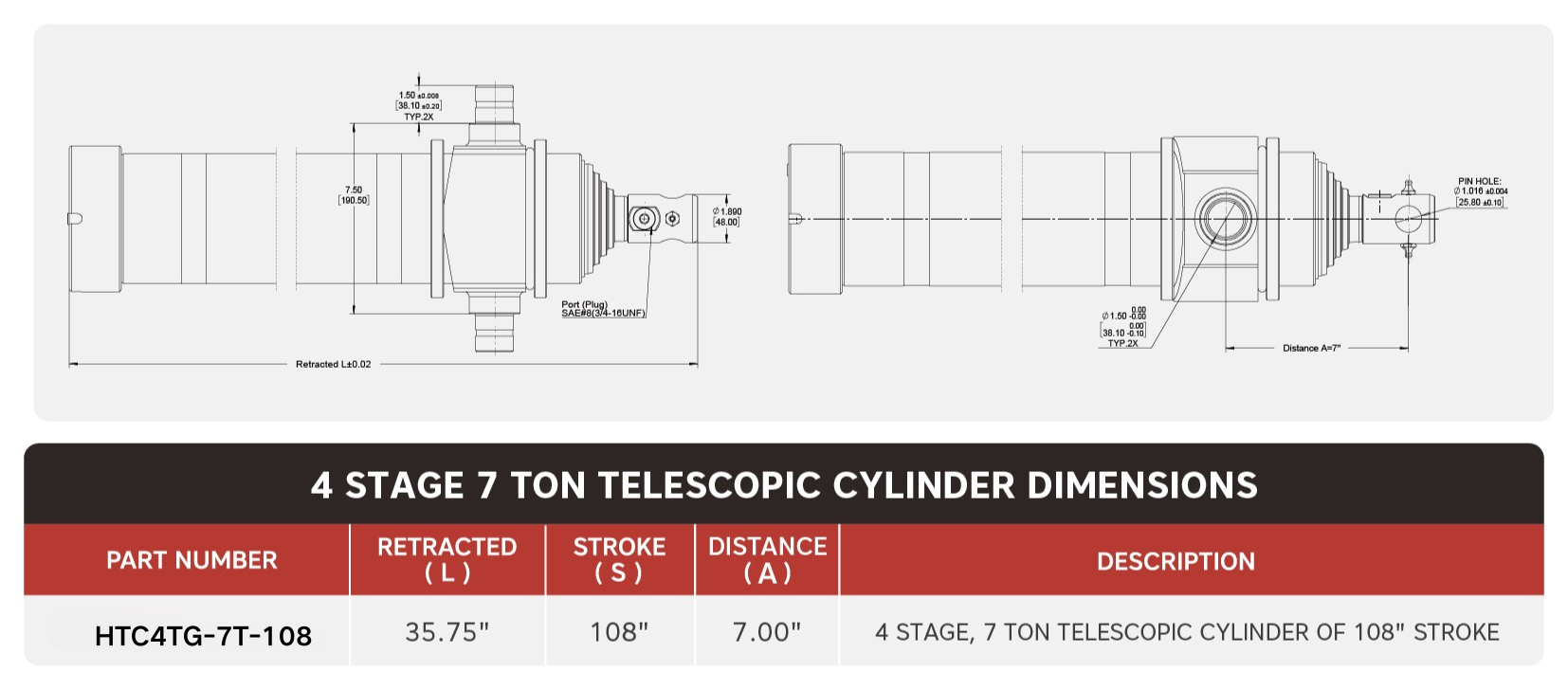 "HTC4TG-7T-108", 4 நிலை, 7 டன் ஆஃப் 108" ஸ்ட்ரோக் டெலஸ்கோபிக் சிலிண்டர்