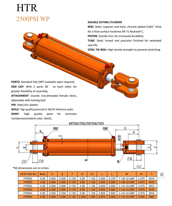 இந்த HCIC ஸ்டாண்டர்ட் க்ளீவிஸ் வெல்டட் சிலிண்டரில் 4" போர், 36" ஸ்ட்ரோக் மற்றும் 2" விட்டம் கொண்ட கம்பி உள்ளது. இரட்டை நடிப்பு SAE 8 (-08) ORB(F) வேலை செய்யும் துறைமுகங்கள் 2,500 PSI அதிகபட்ச வேலை அழுத்தம் க்ளீவிஸ் ஏற்றுகிறார் 1" மவுண்டிங் பின்கள் சேர்க்கப்பட்டுள்ளன பளபளப்பான கருப்பு வண்ணப்பூச்சு நீடித்தது மற்றும் மங்குவதை எதிர்க்கிறது